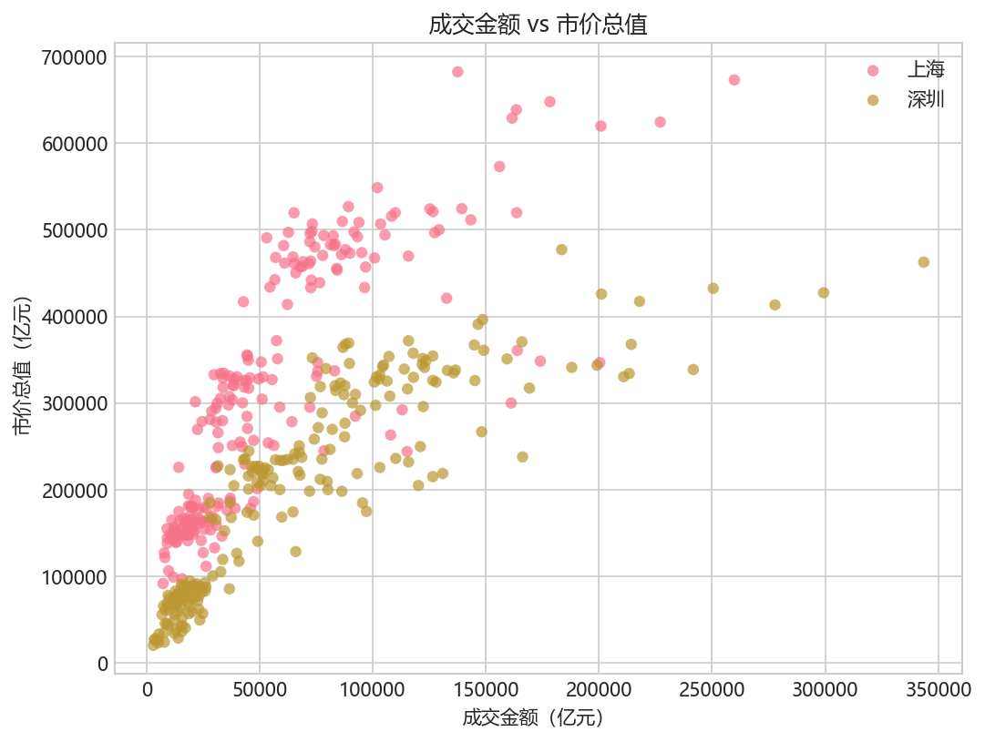 - 散点矩阵:市值 vs 成交额 vs 成交量,观察规模与活跃度的关系。