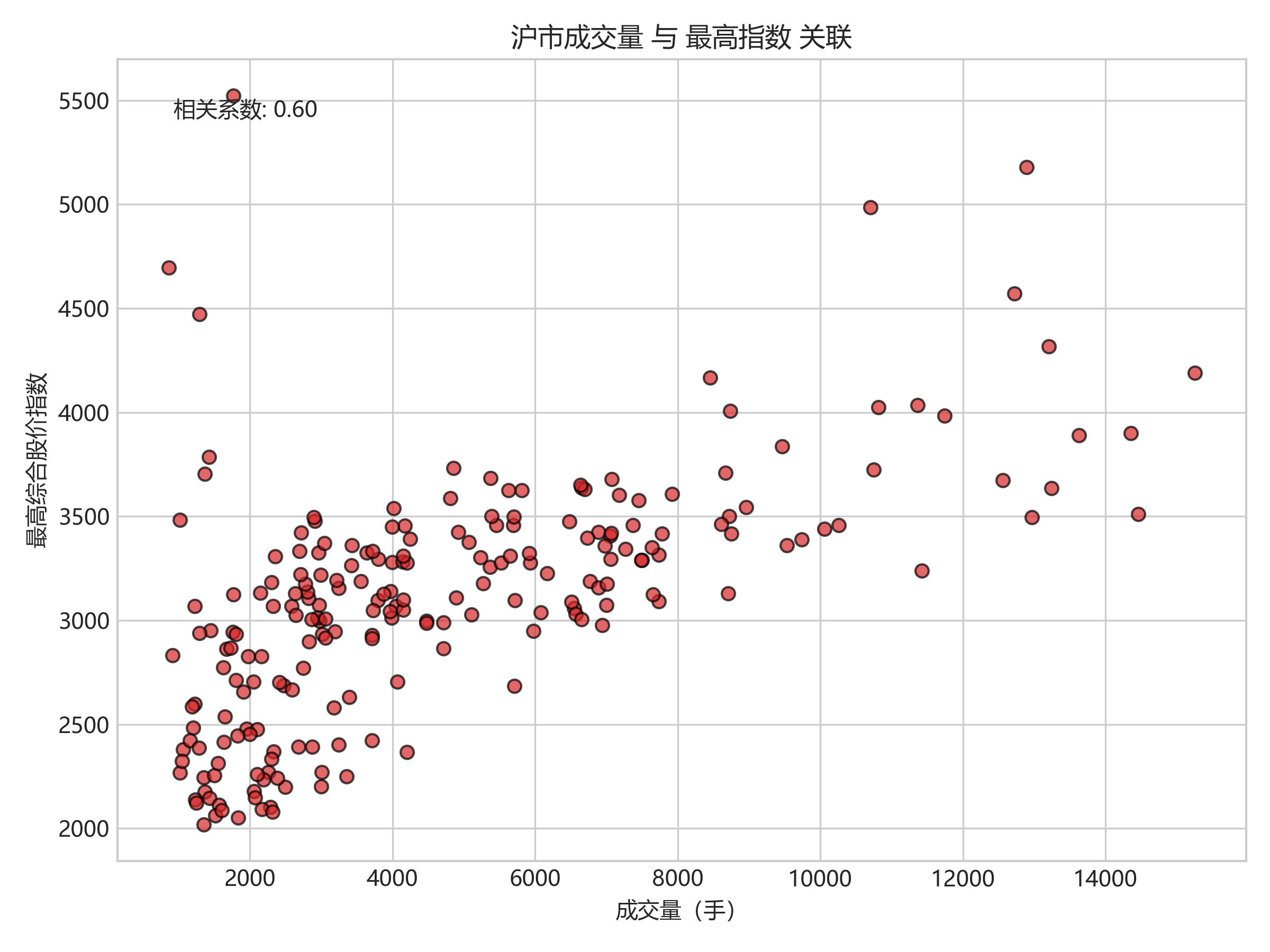 | 指数最高值 ↔ 成交量(全市场) | 0.69 | 最高指数出现时,成交量往往放大,说明投资者在行情高点活跃。 |