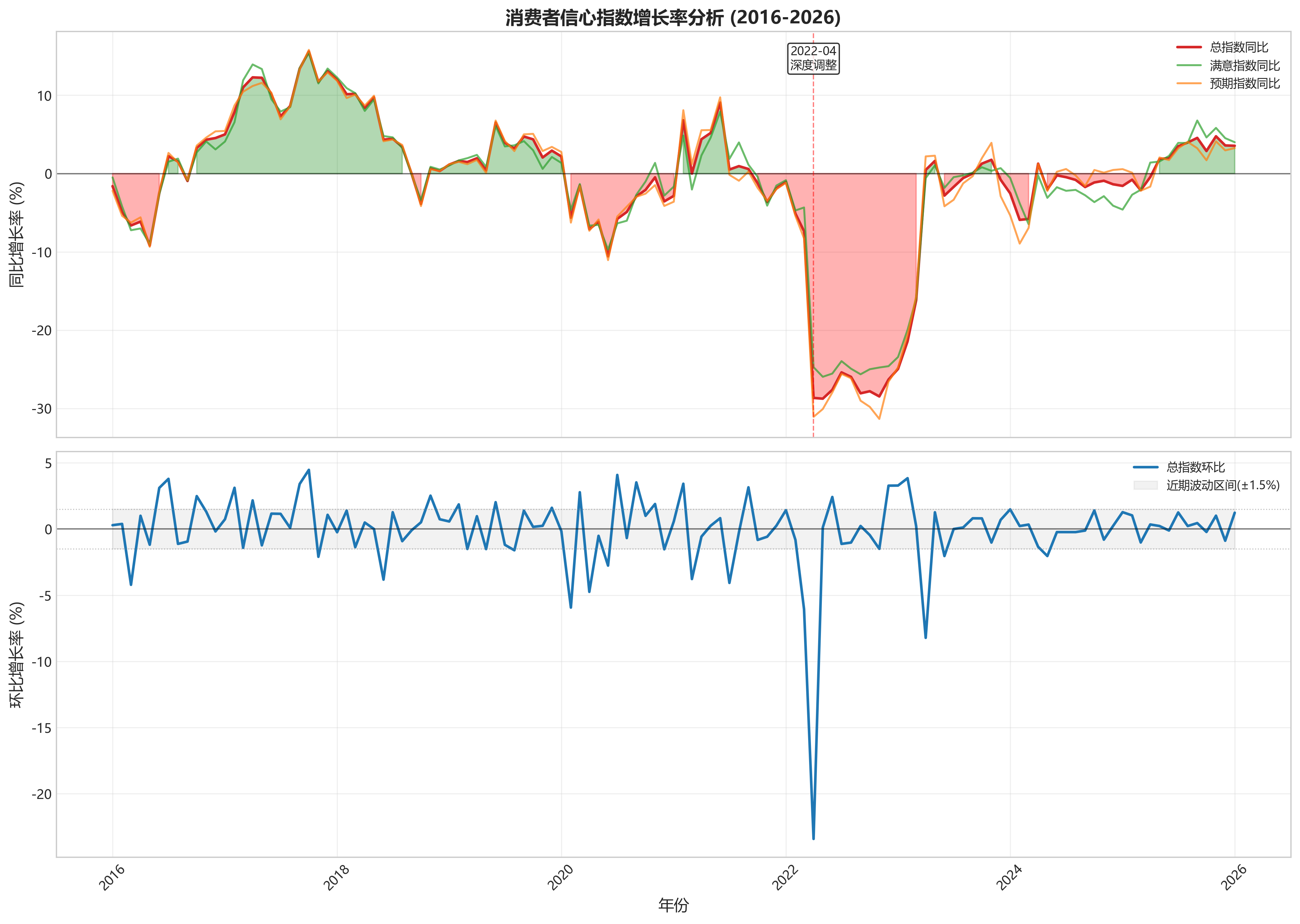 - 近期驱动:观察2025年7月至2026年1月的回升期,消费者预期指数的环比增长(1.12%, 0.22%, 0.45%, 0.45%, 1.45%, 1.77%)整体略强于消费者满意指数(1.62%, 0.11%, 2.39%, -1.56%, 0.56%, 0.57%)。这表明近期的信心修复主要源于对未来展望的边际改善。