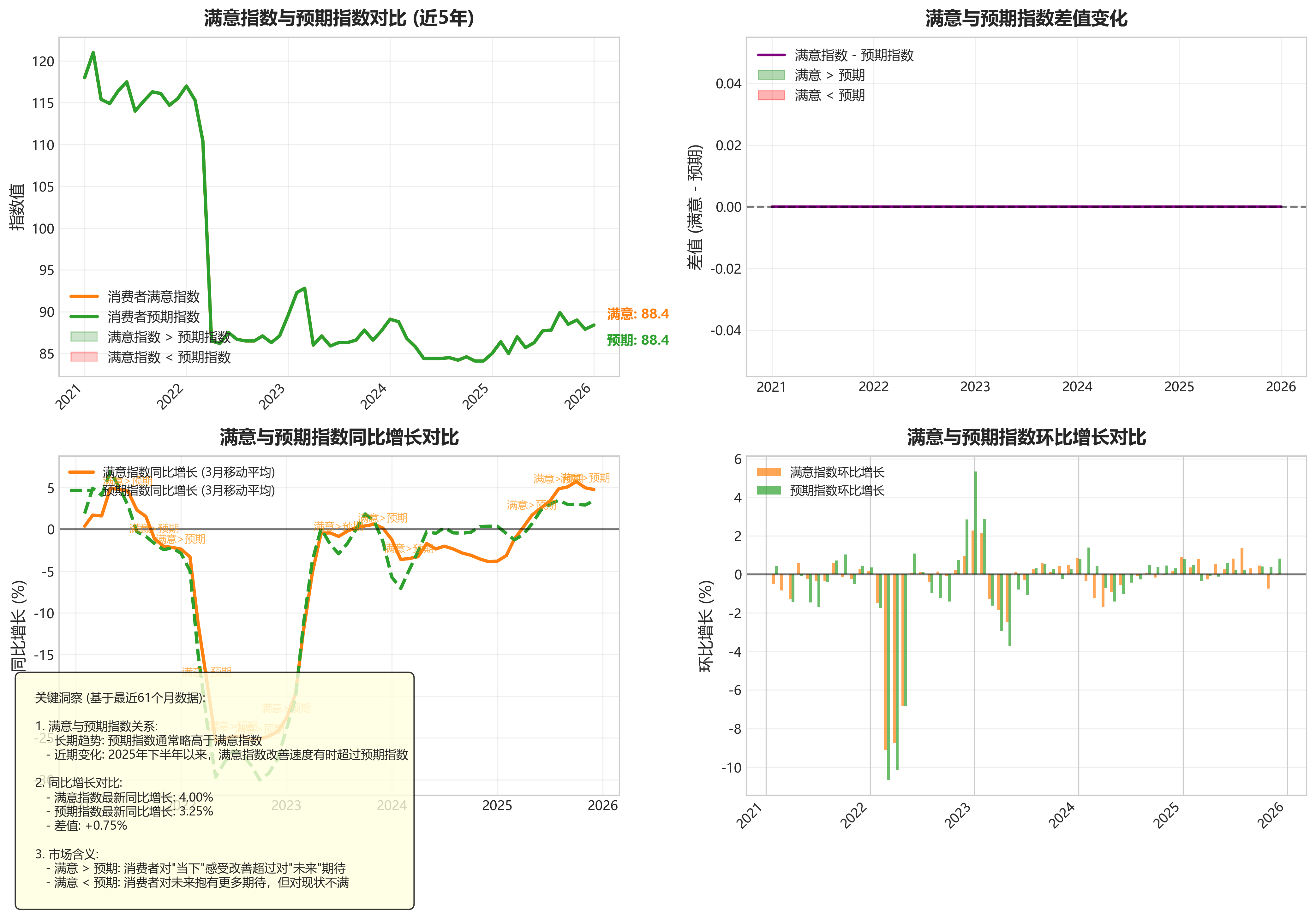 满意指数与预期指数走势对比: 两者长期趋势高度同步,但在波动幅度和时点上存在差异,揭示了重要的经济信号: