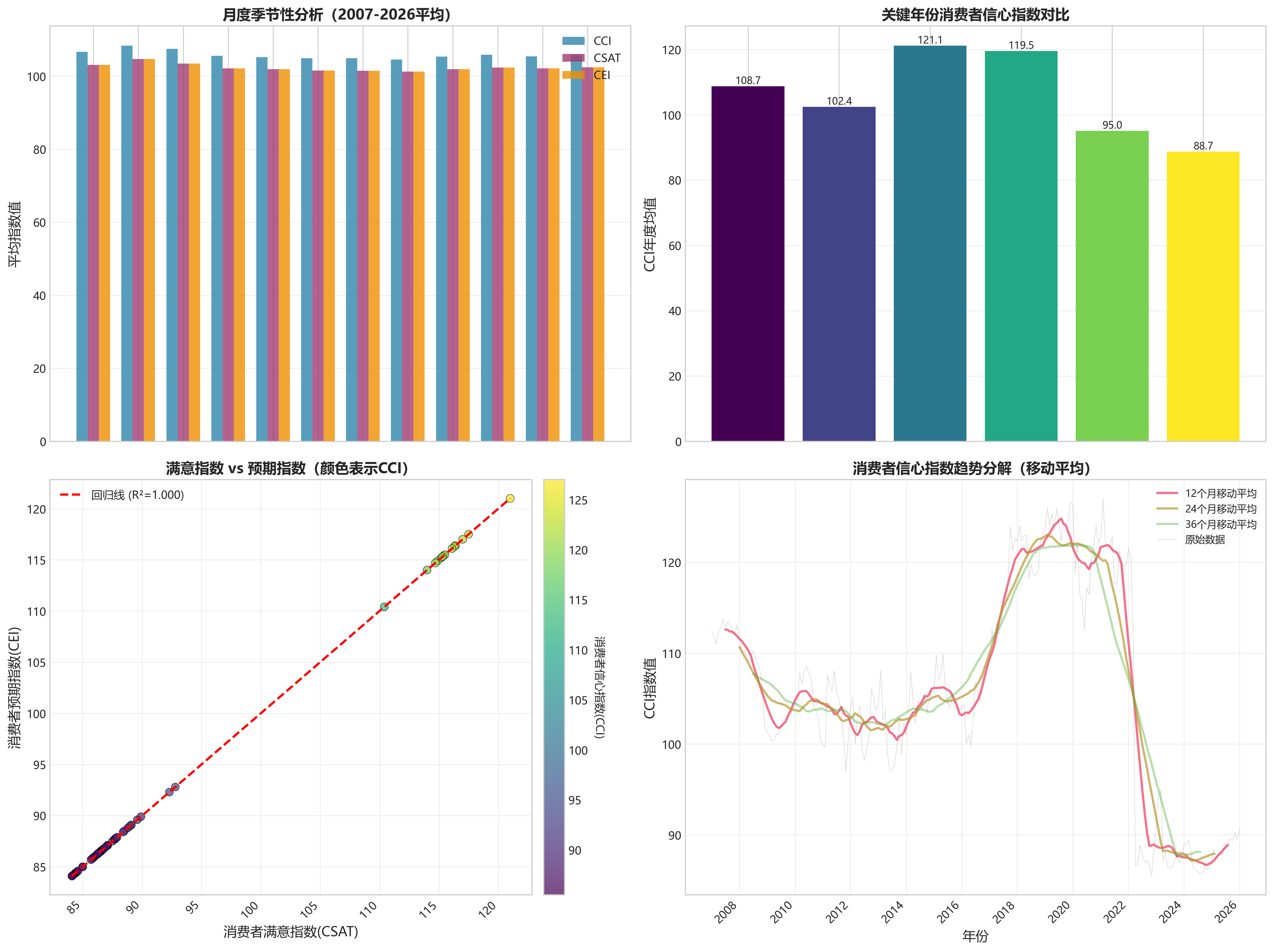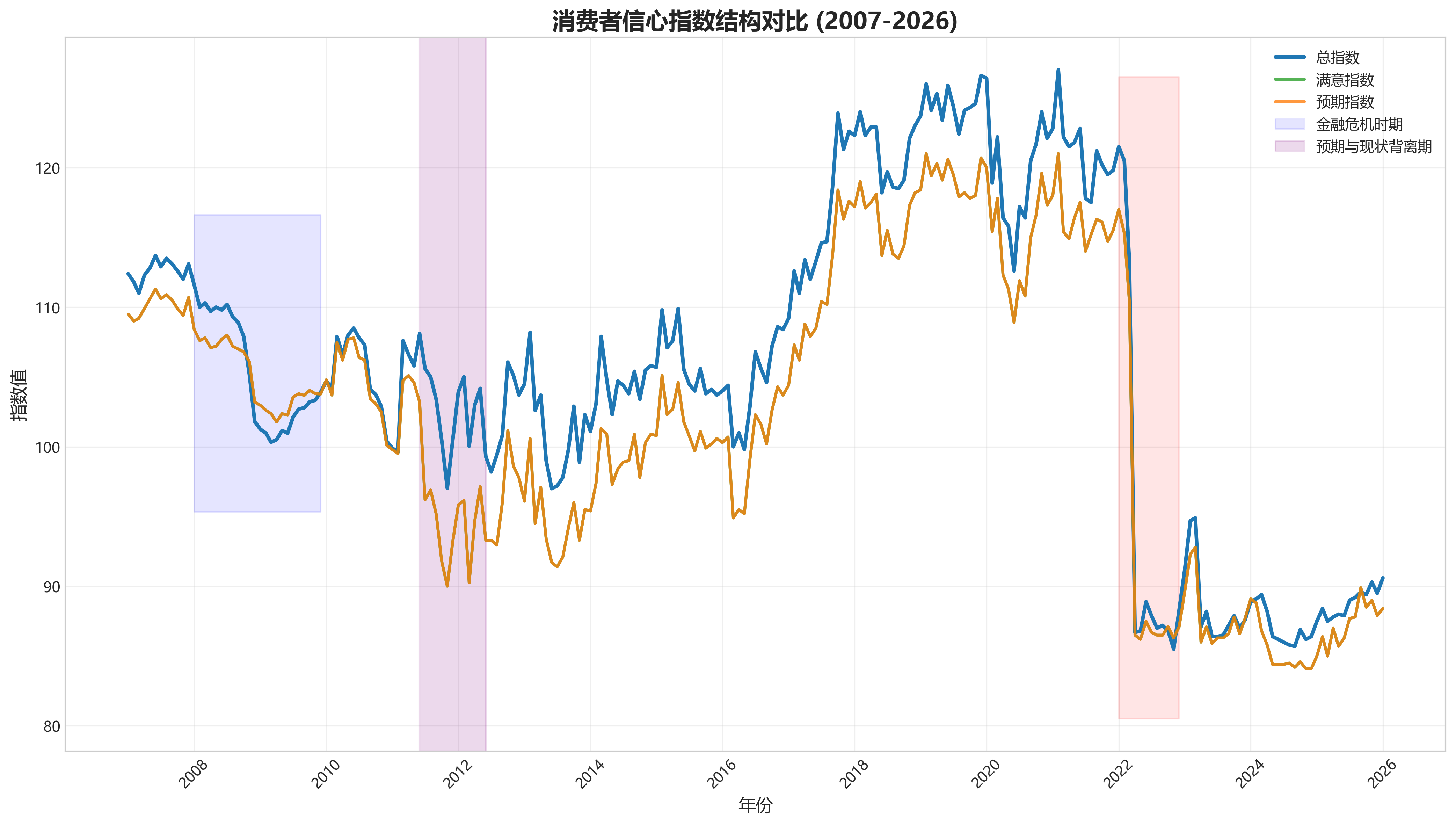 - 高位运行期(2007-2017年):在2017年10月达到历史最高点(123.9)。这十年间,尽管有波动,但消费者信心指数、满意指数和预期指数大部分时间都在100分以上,表明消费者整体心态积极。