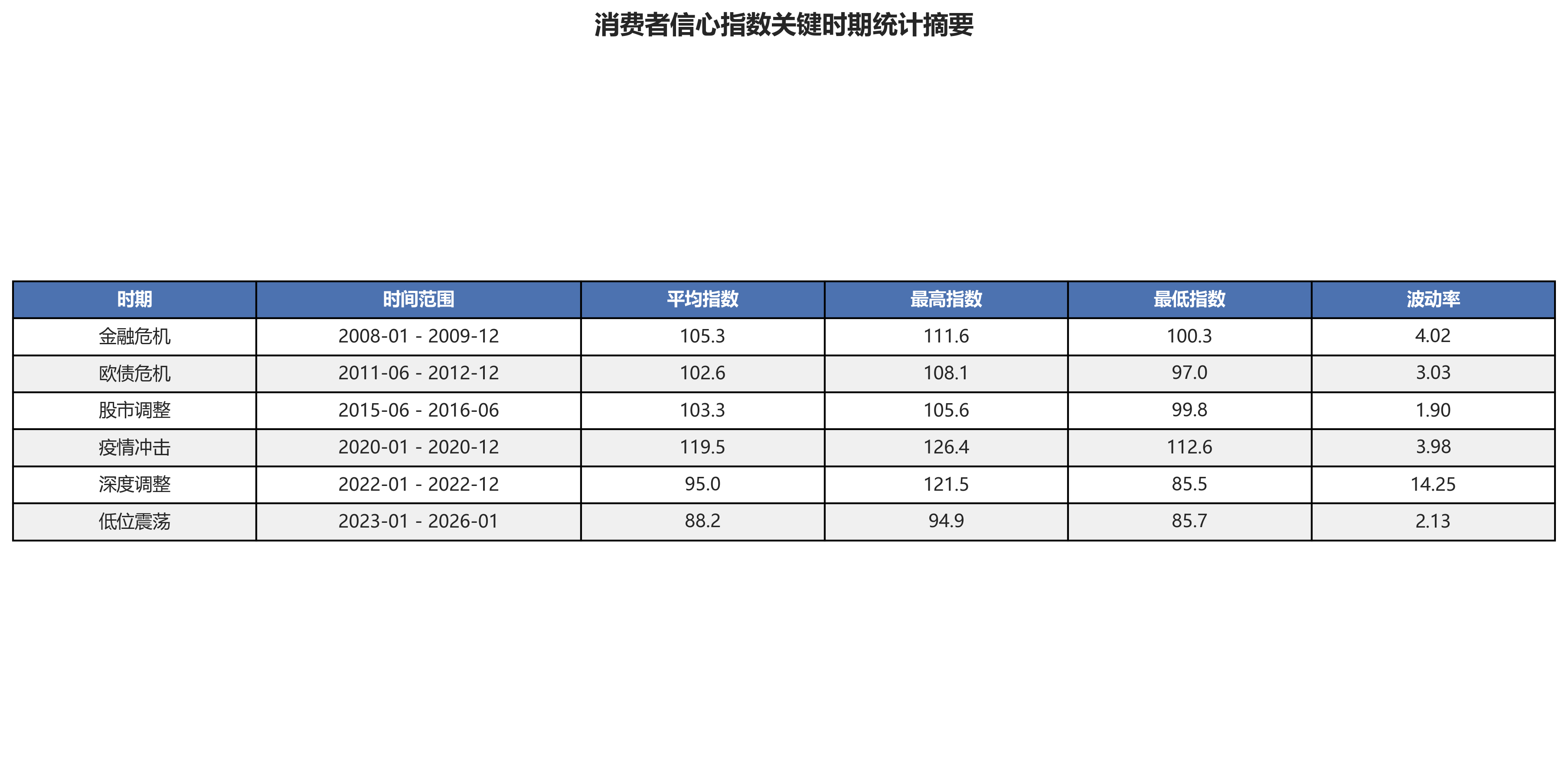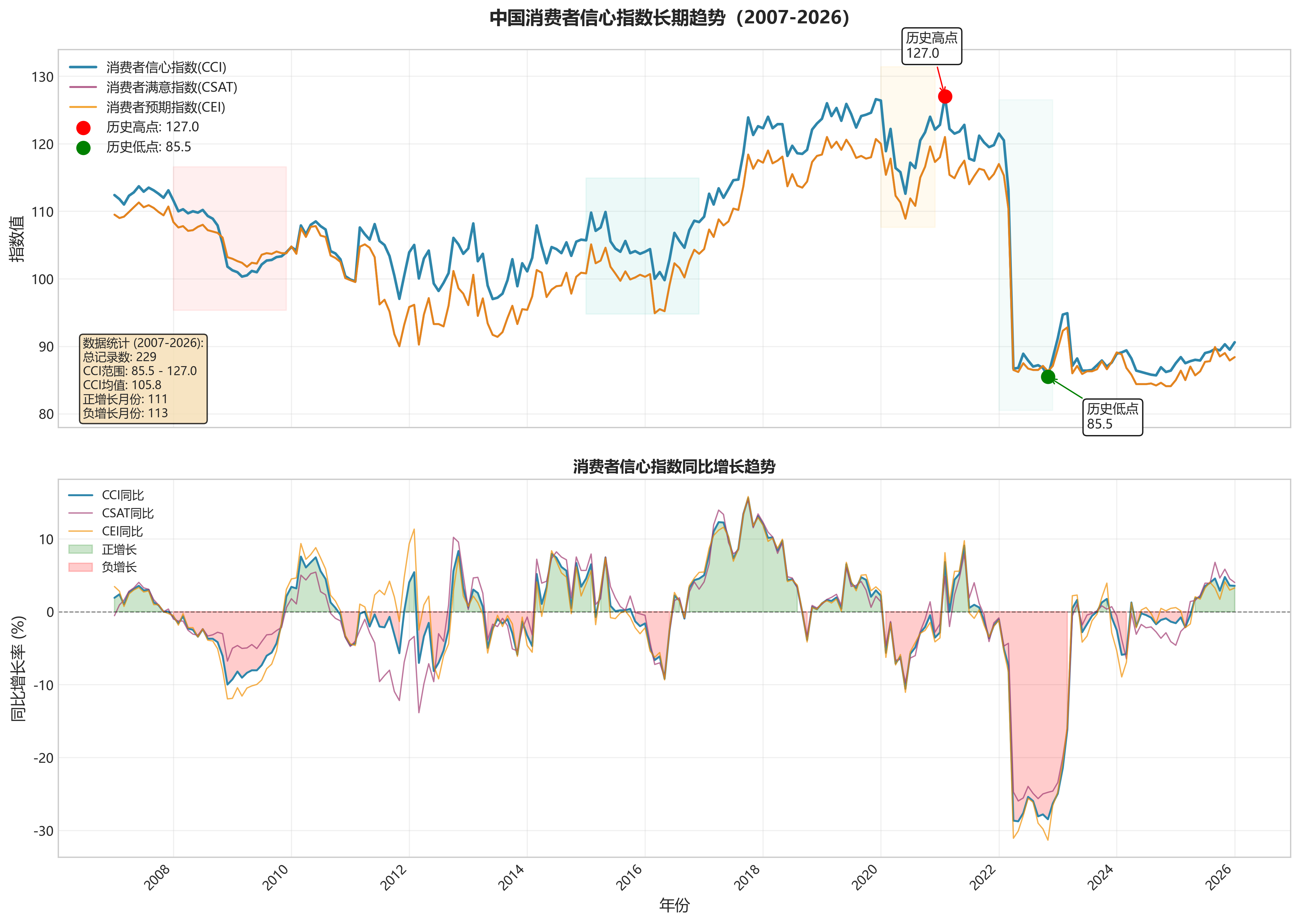 长期趋势分析: 自2007年1月至2026年1月的19年间,中国消费者信心指数(CCI)呈现出显著的“先扬后抑,低位企稳”的长期轨迹。整体可分为三个阶段: