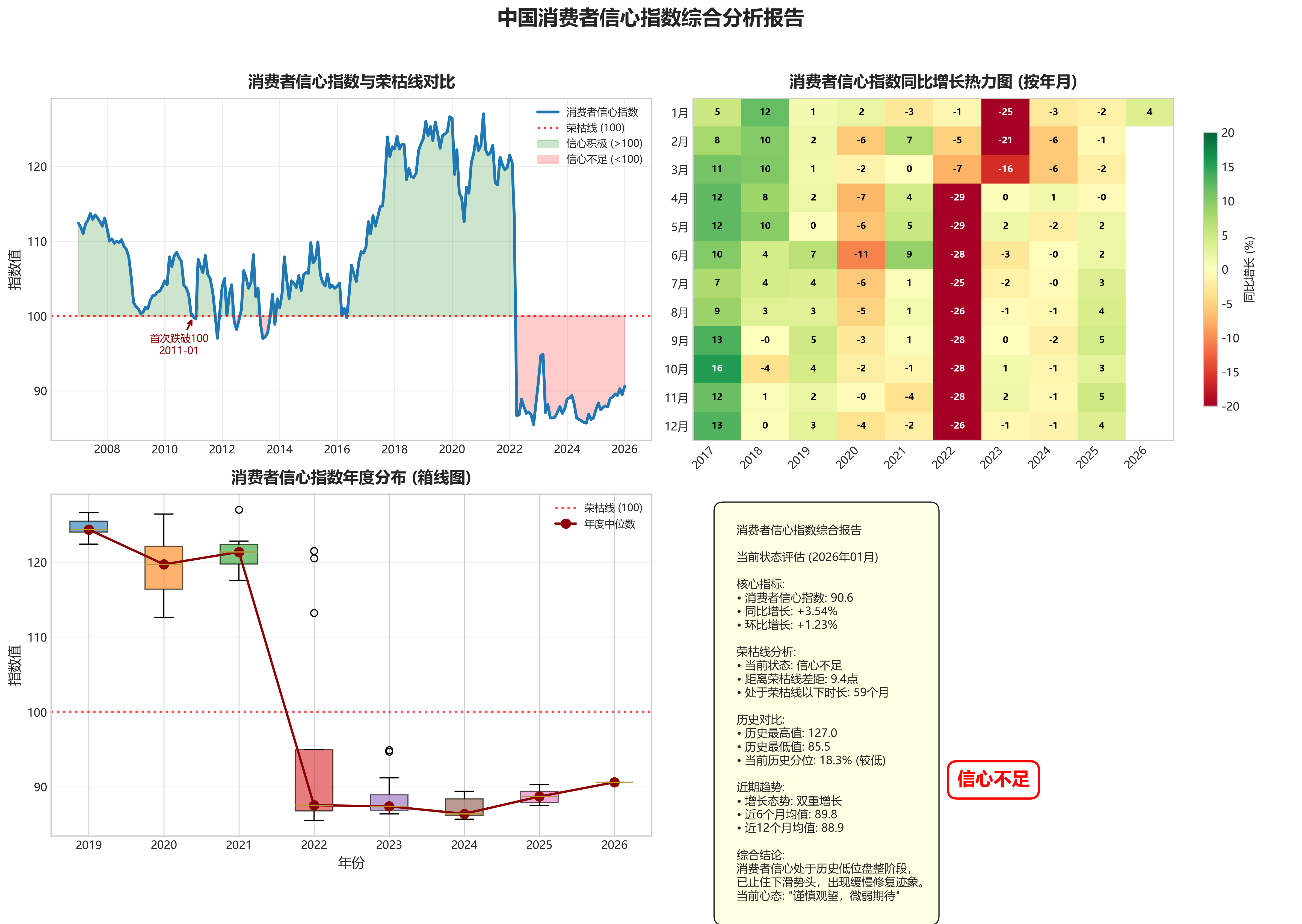 - 当前数值(2026年1月为90.6):明确处于100以下,说明消费者信心整体偏弱,对经济和个人财务状况的乐观程度不足。