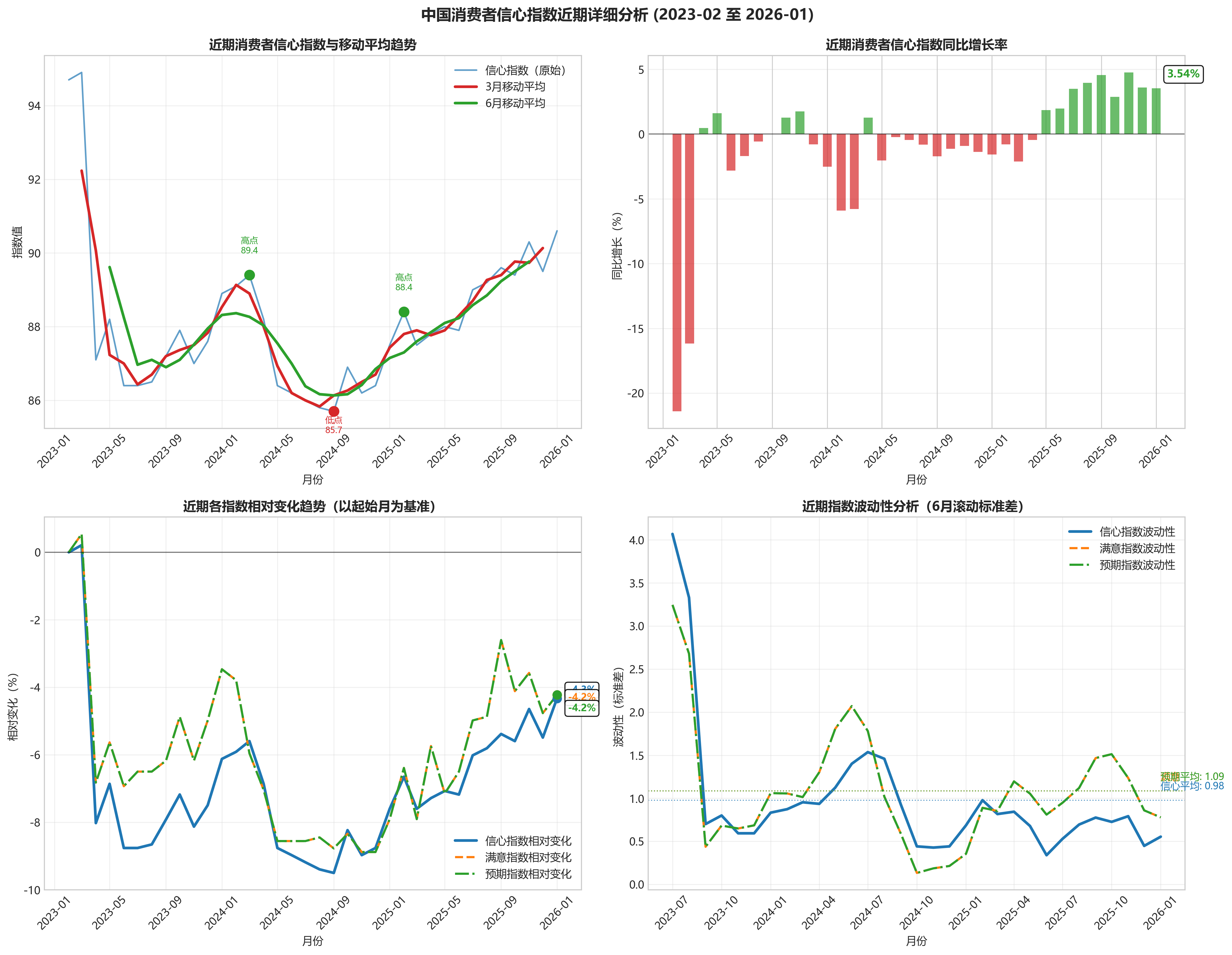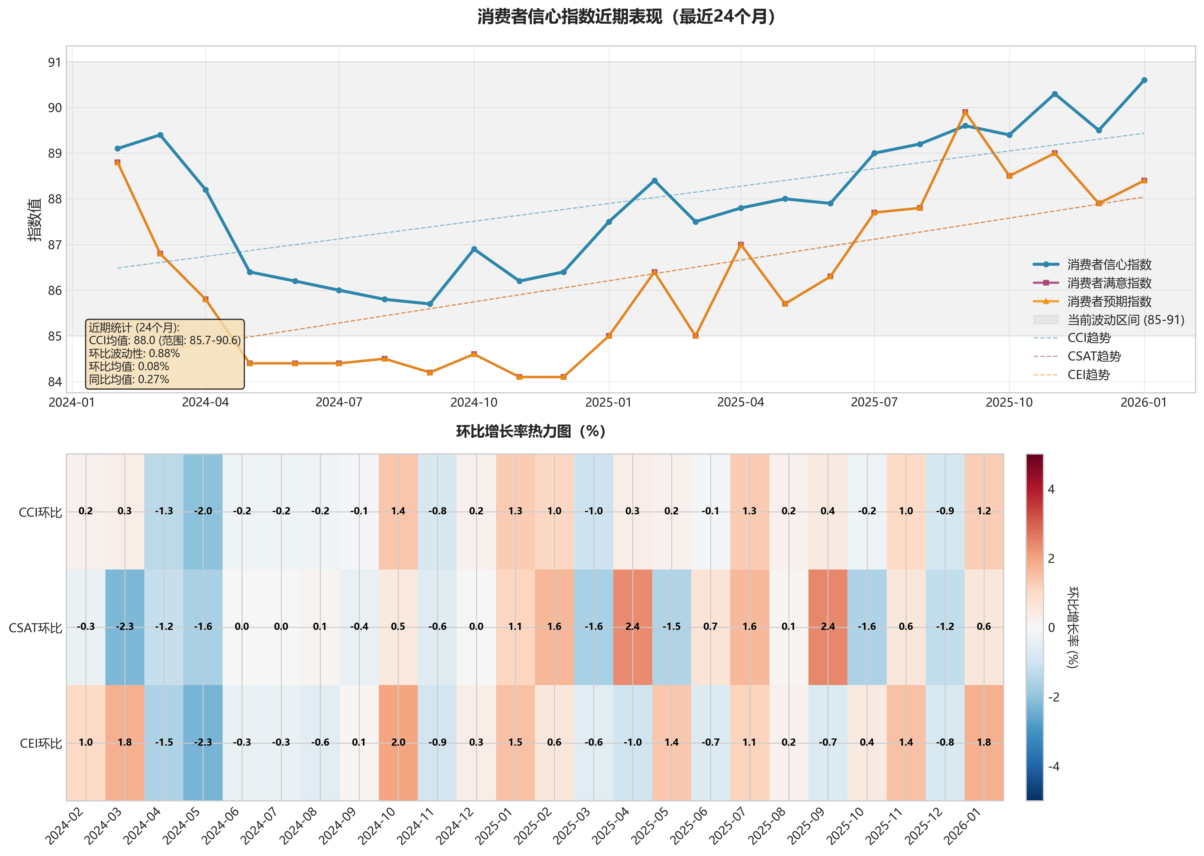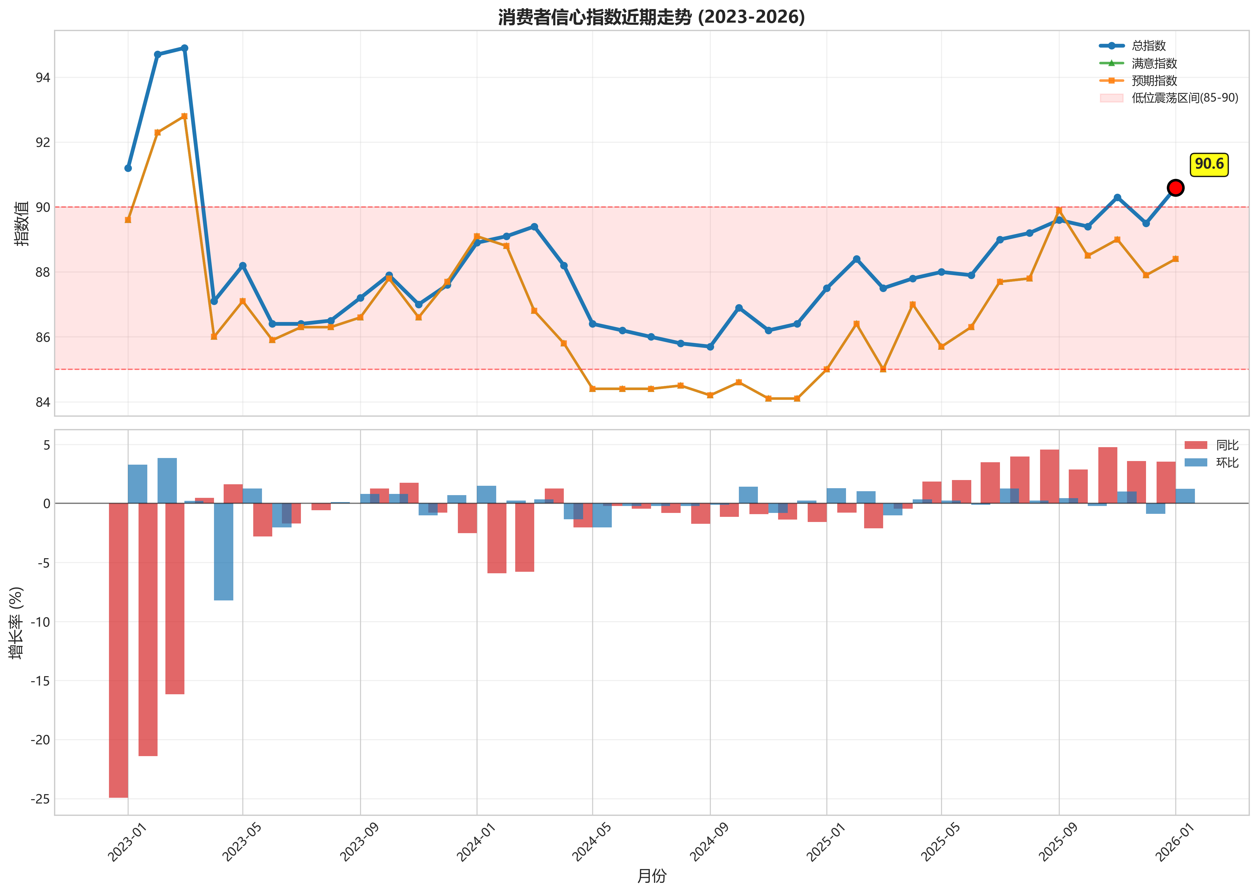 当前信心状况评估(基于最新数据): 截至2026年1月,消费者信心指数为90.6,环比增长1.2%,同比增长3.5%。满意指数与预期指数分别为88.4和88.4。综合判断: