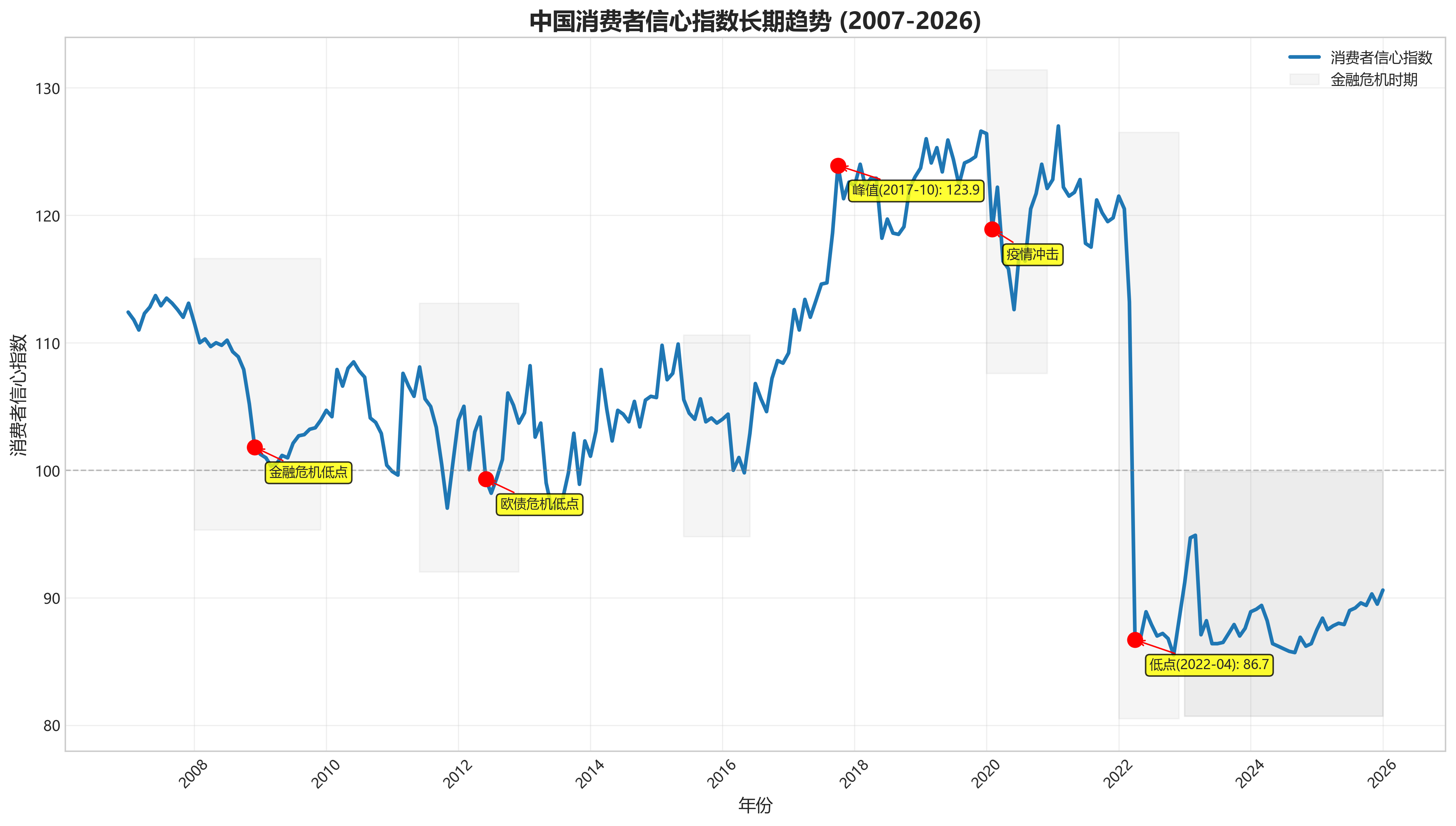 从2007年到2026年初这近20年的数据来看,中国消费者信心整体呈现“先高后低,近期低位徘徊”的波浪形走势。
