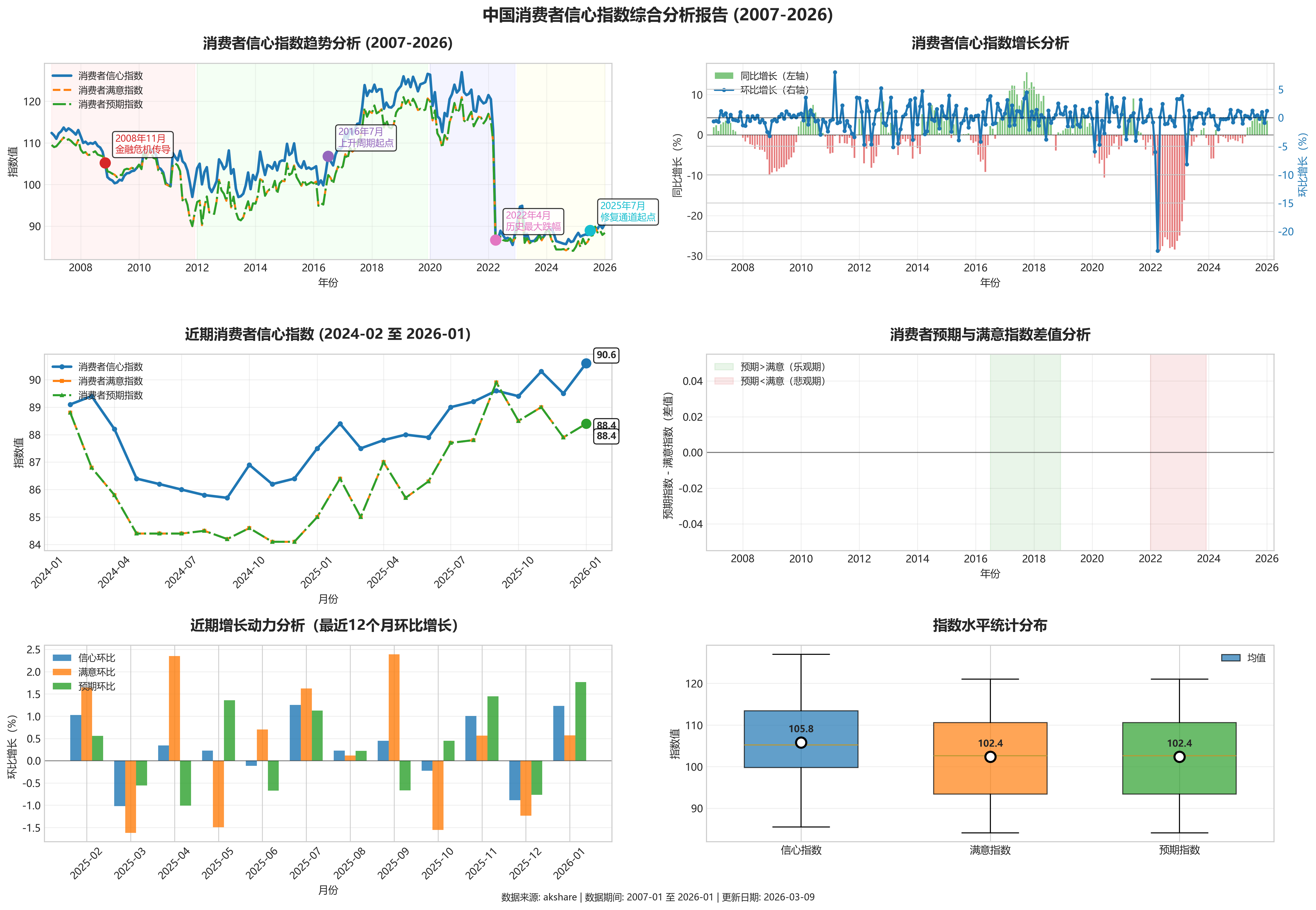 macro_china_xfzxx),统计周期为2007年1月至2026年1月,共229个月度数据点,数据抓取时间为2026年3月5日。数据覆盖近20年,具有较长的历史纵深,且包含最新的2026年1月数据,时效性极强,可用于分析长期趋势和近期动态。 - 指标构成:核心分析指标为消费者信心指数及其两个子维度:消费者满意指数(反映当前状况)和消费者预期指数(反映未来展望)。每个指标均提供指数值、同比增长率(%)和环比增长率(%),为分析绝对水平、长期趋势和短期波动提供了完整的数据基础。