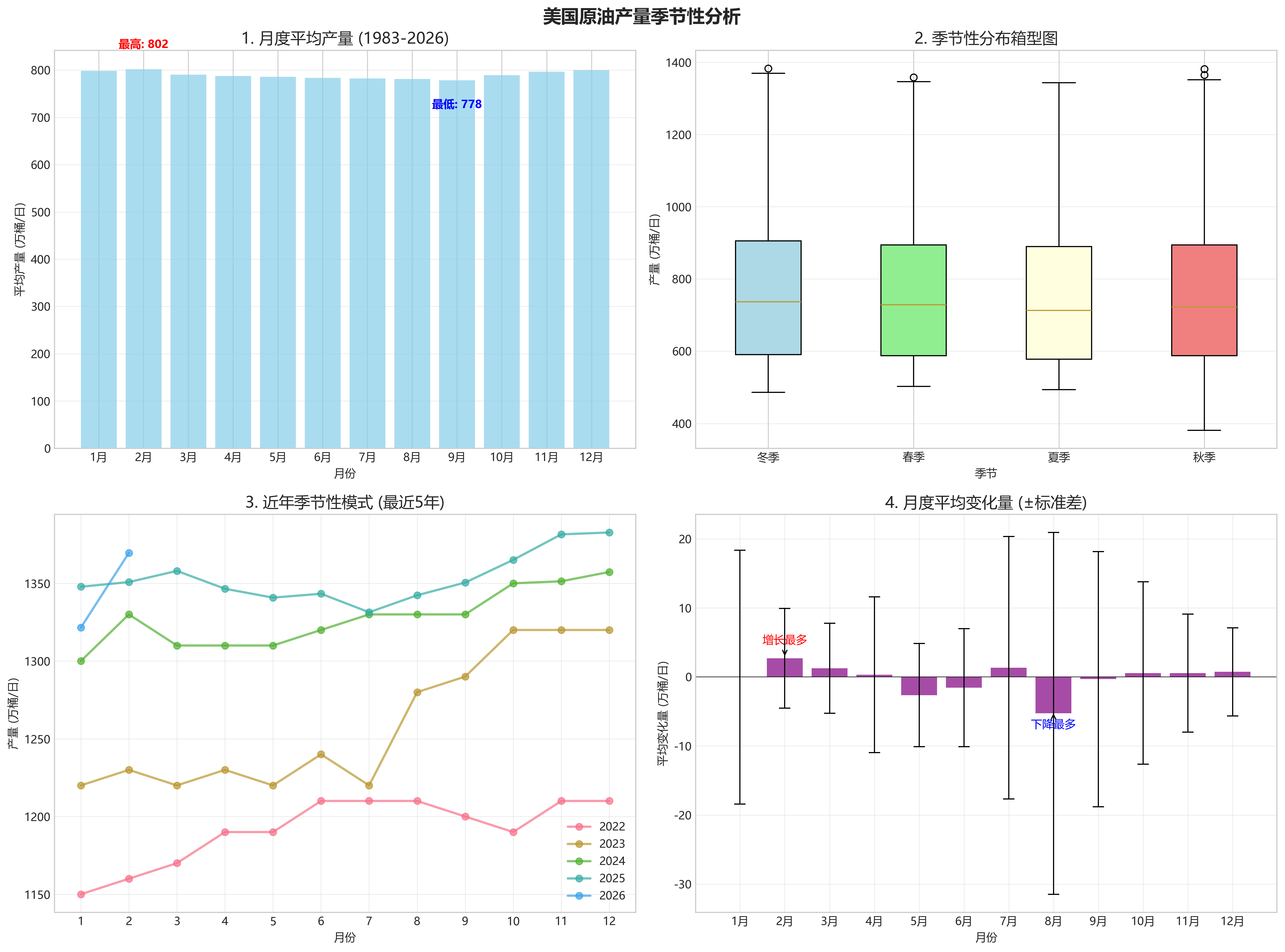- 冬季(12-2月):尤其是1-2月,受寒冷天气影响,部分产区(如巴肯)作业效率下降,产量可能出现季节性下滑(如2021、2022、2026年1月数据均显示明显下降)。这种季节性在页岩油时代更为明显。