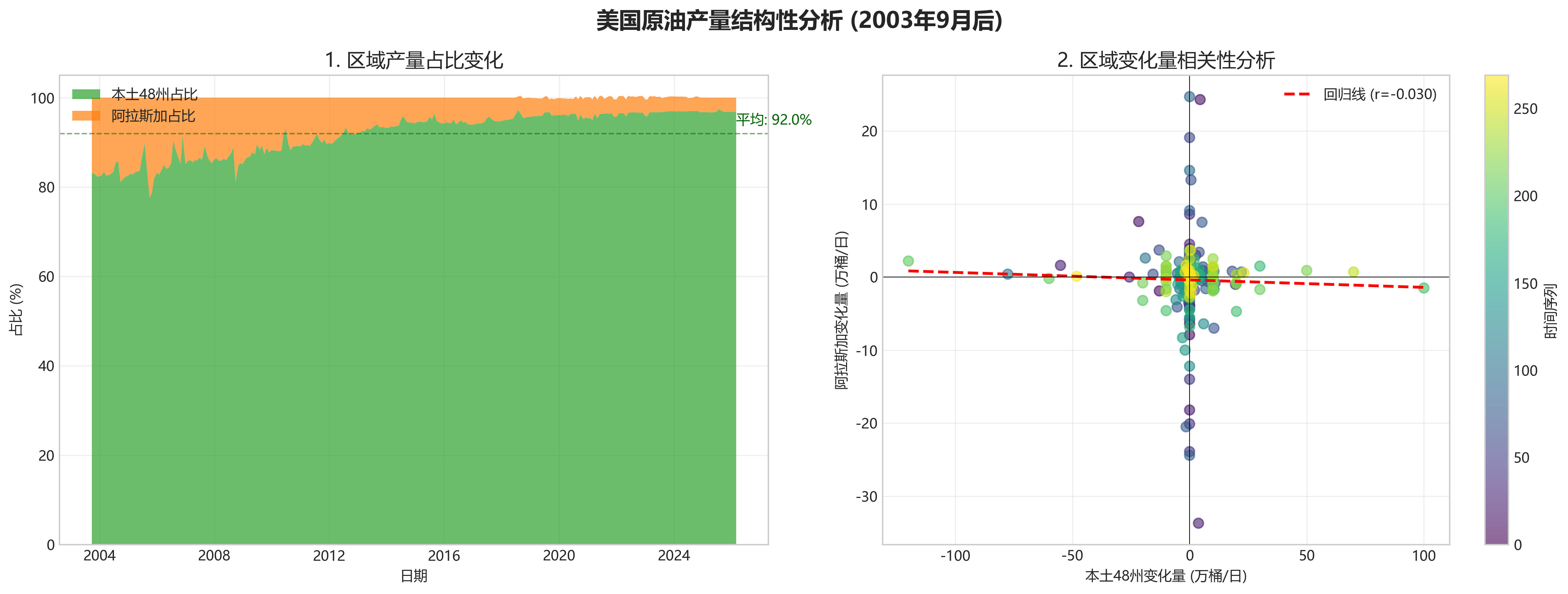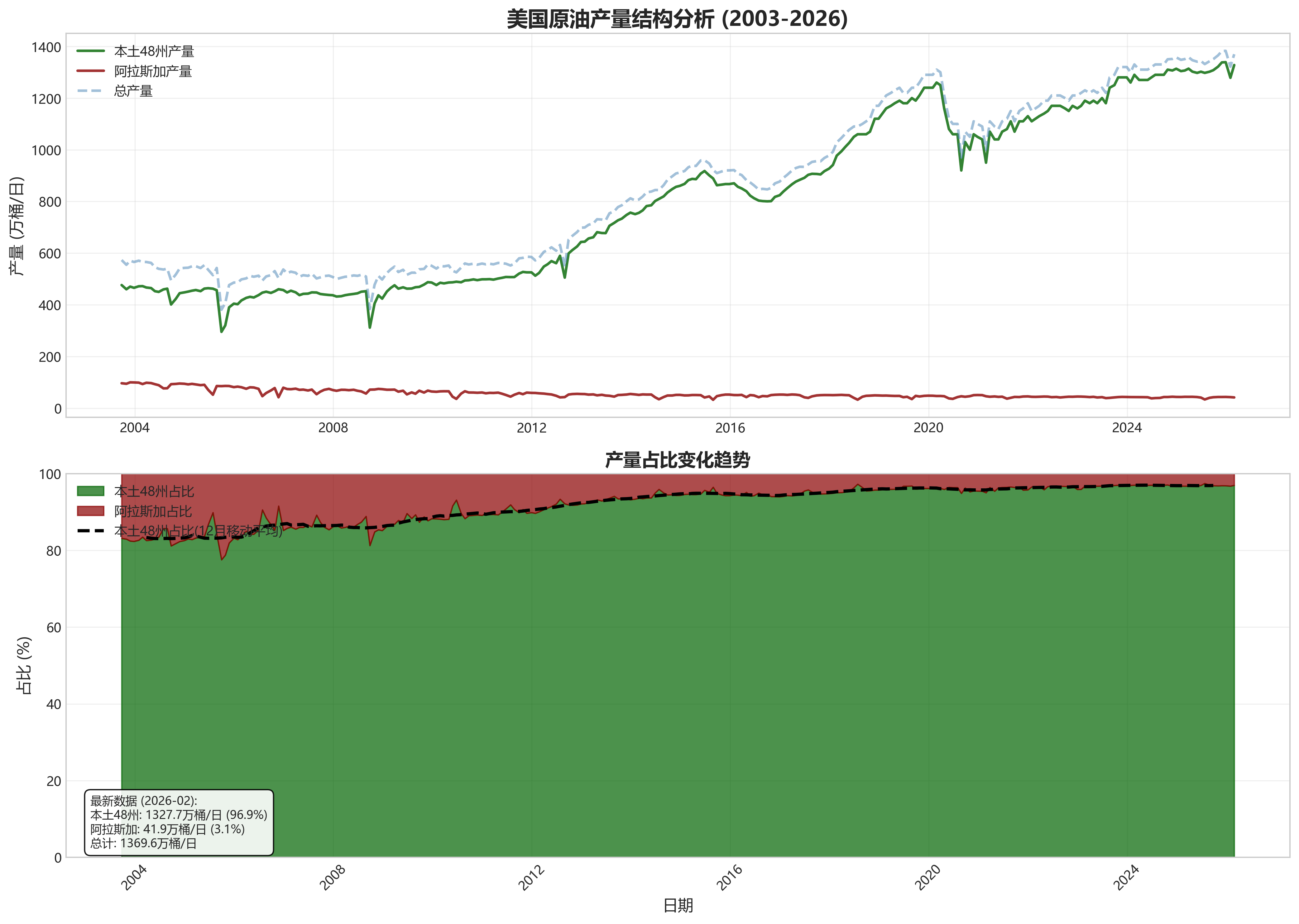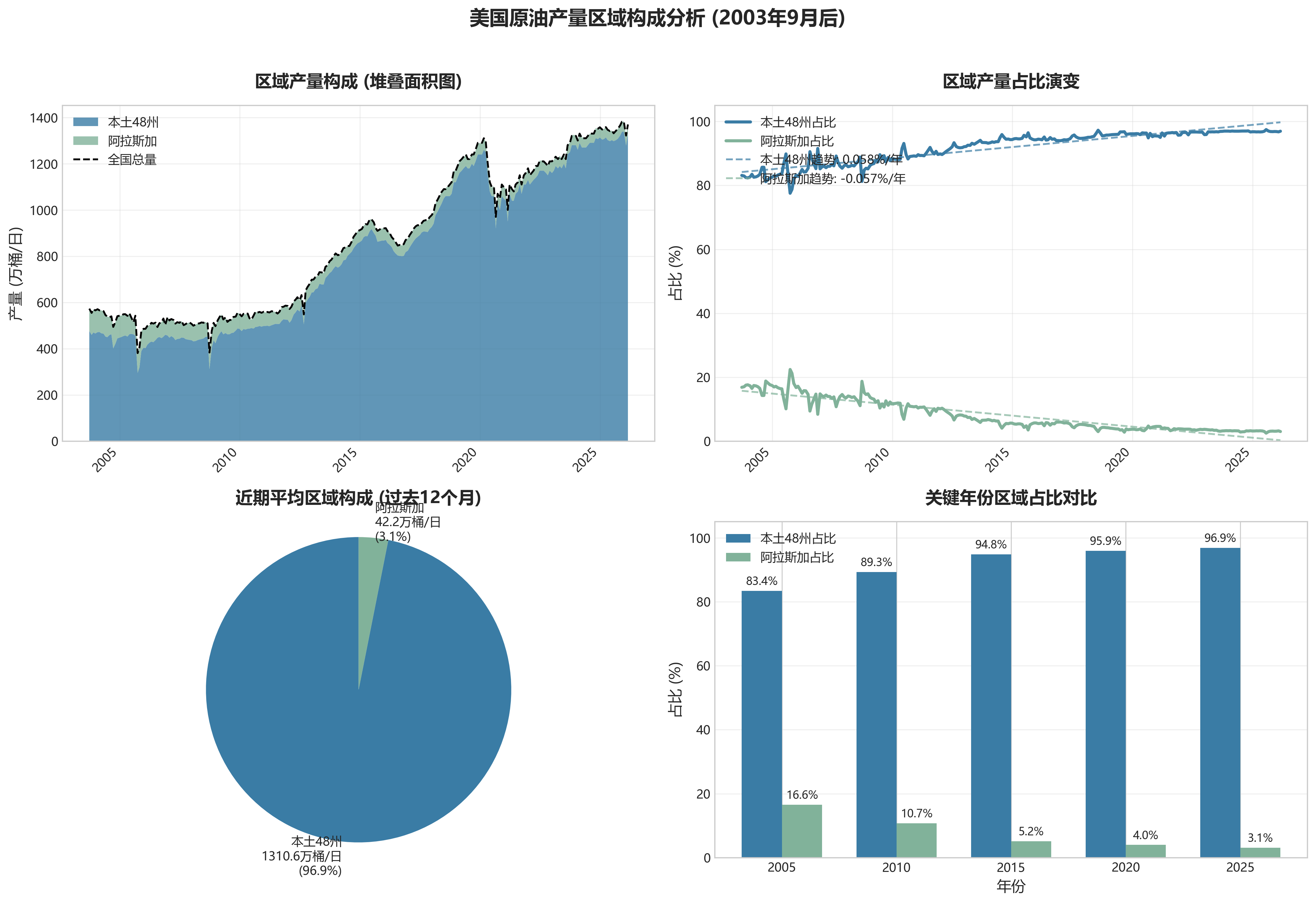 产量结构演变:由于早期区域数据缺失,完整分析始于2003年。自那时起,“本土48州”产量占比呈现持续、快速的上升趋势。