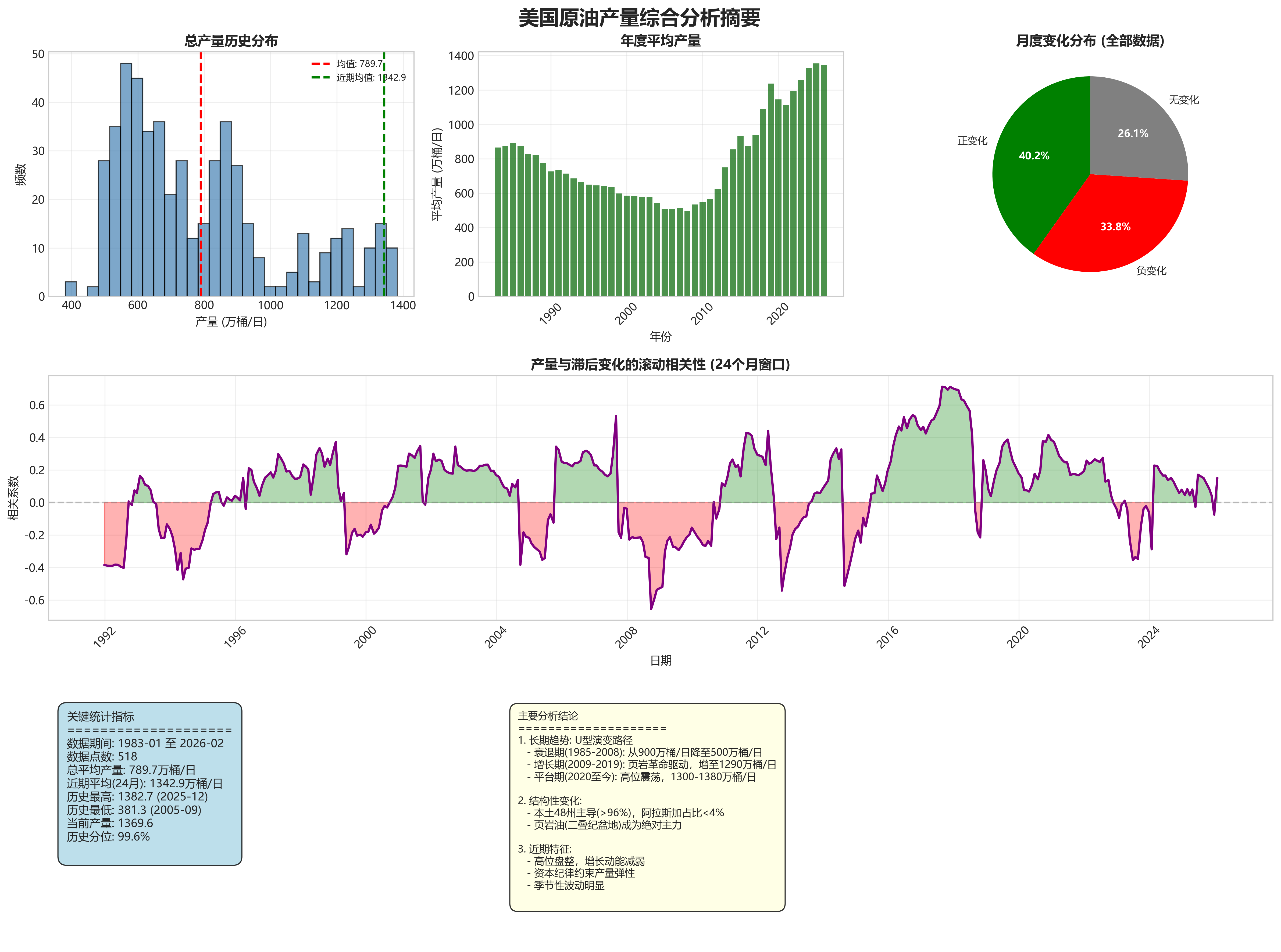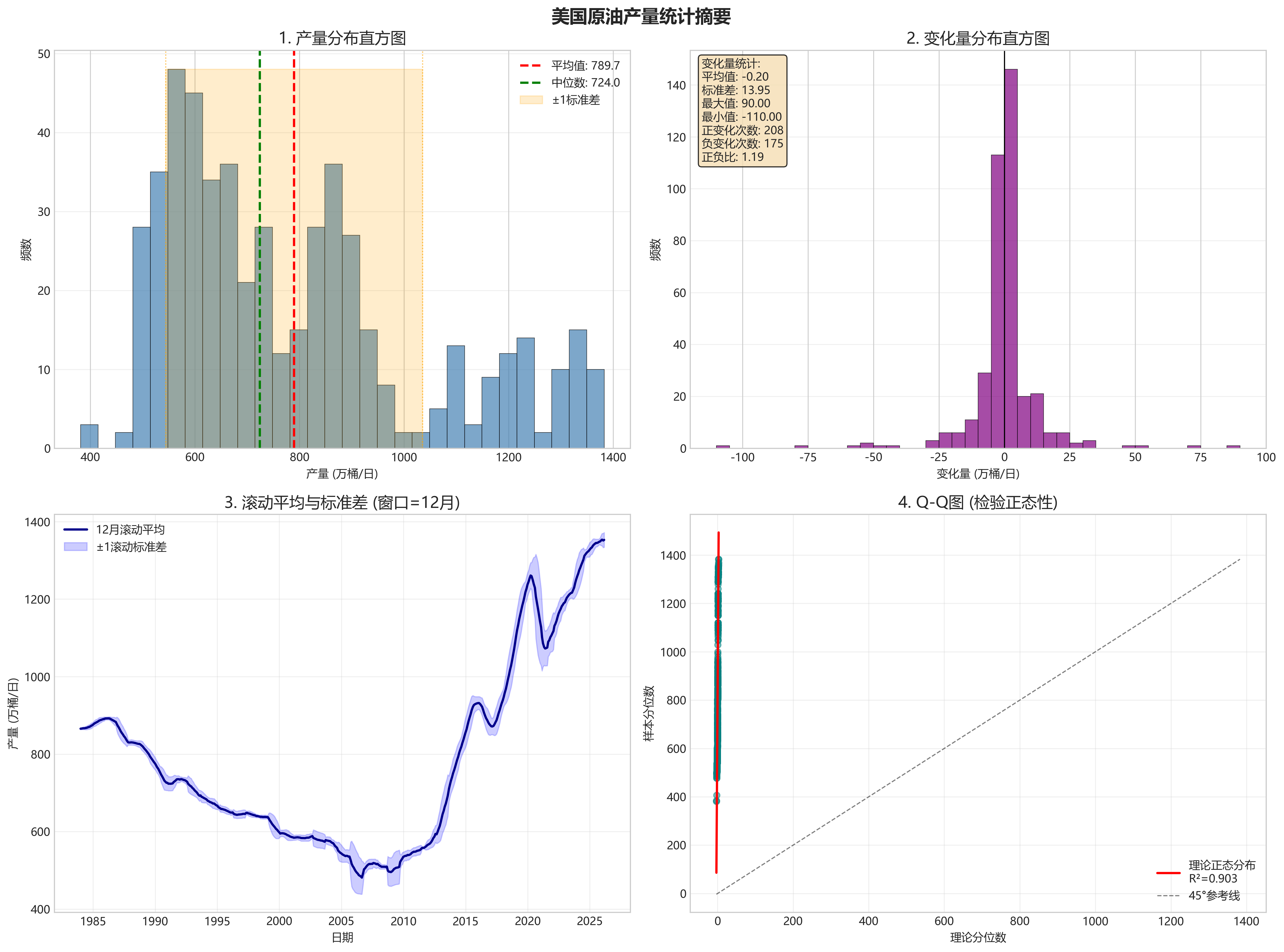 - 数据源与范围:数据来源于 akshare,指标为 “美国原油产量”。时间序列覆盖 1983年1月28日至2026年2月27日,共计 518 个数据点(月度频率)。数据获取时间为2026年3月7日。