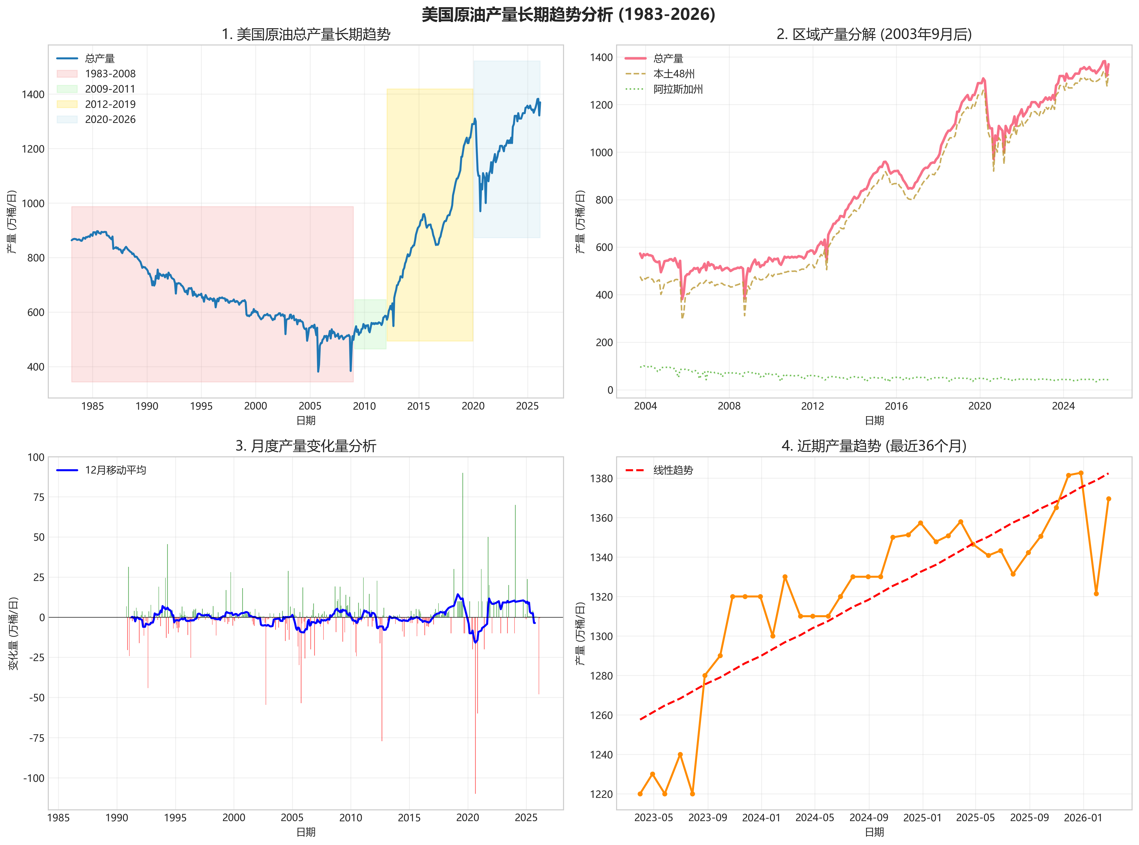 - 季节性波动:数据显示出一定的季节性,特别是阿拉斯加产量在夏季(6-8月)常因维护等因素出现下滑,导致总量出现短期回调。