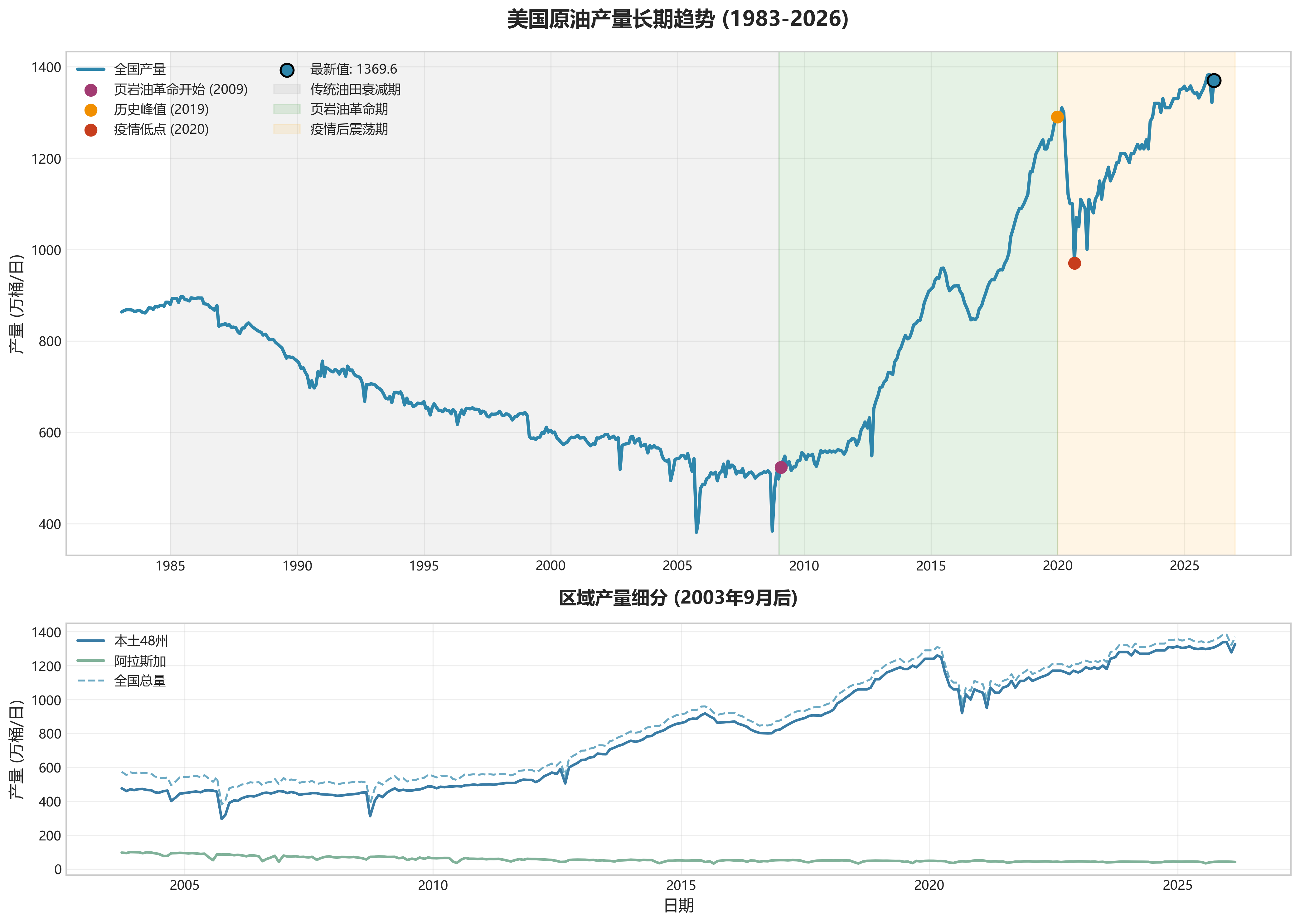 - 长期趋势:美国原油产量呈现清晰的“U型”轨迹。
