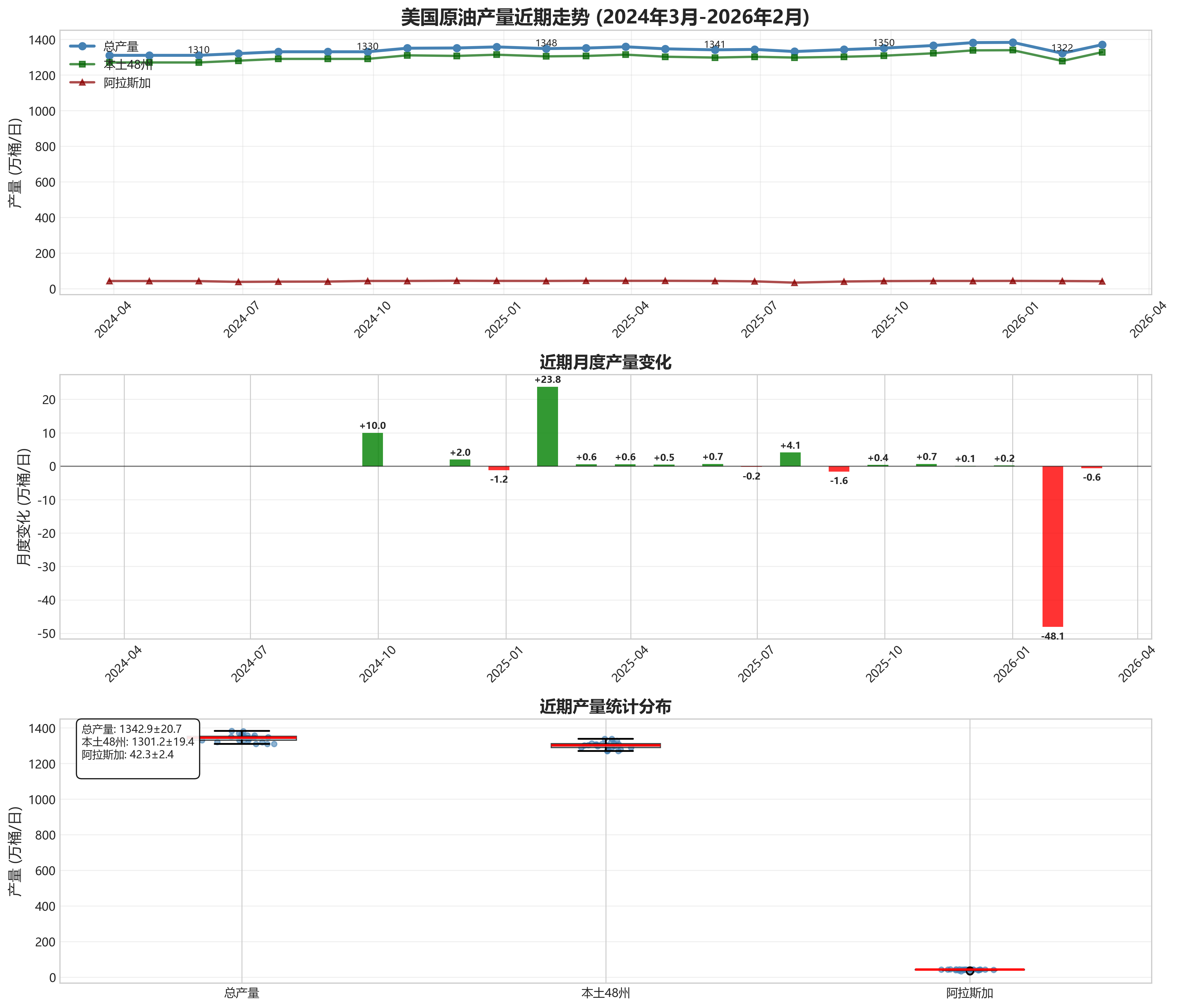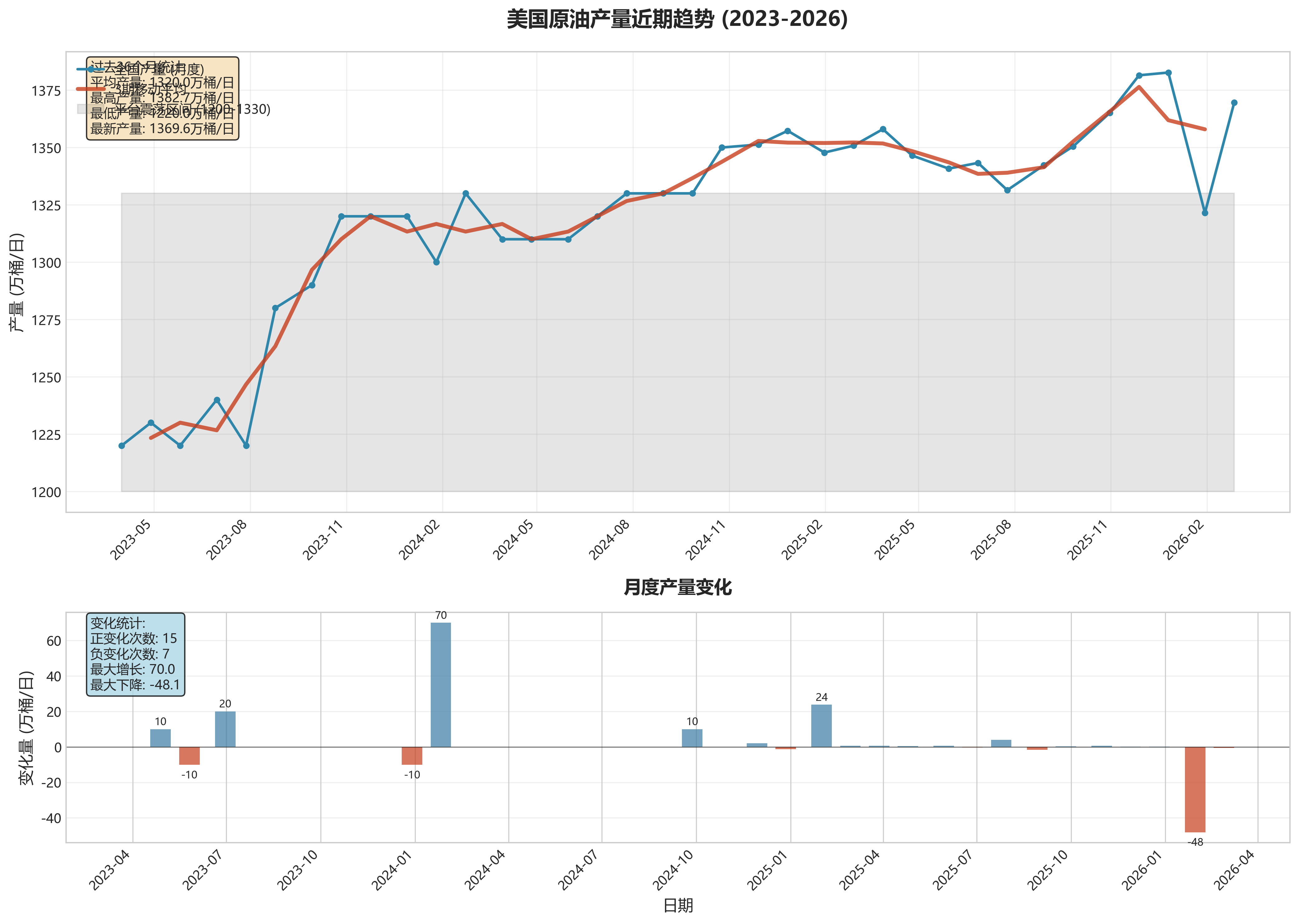 近期动态(最近36个月,约2023年3月至2026年2月):短期趋势呈现 高位窄幅波动 特征。产量主要在 1220万桶/日至1382万桶/日 之间运行。未呈现明确的单边趋势,月度变化幅度大多在±20万桶/日以内,显示生产活动趋于稳定和成熟。