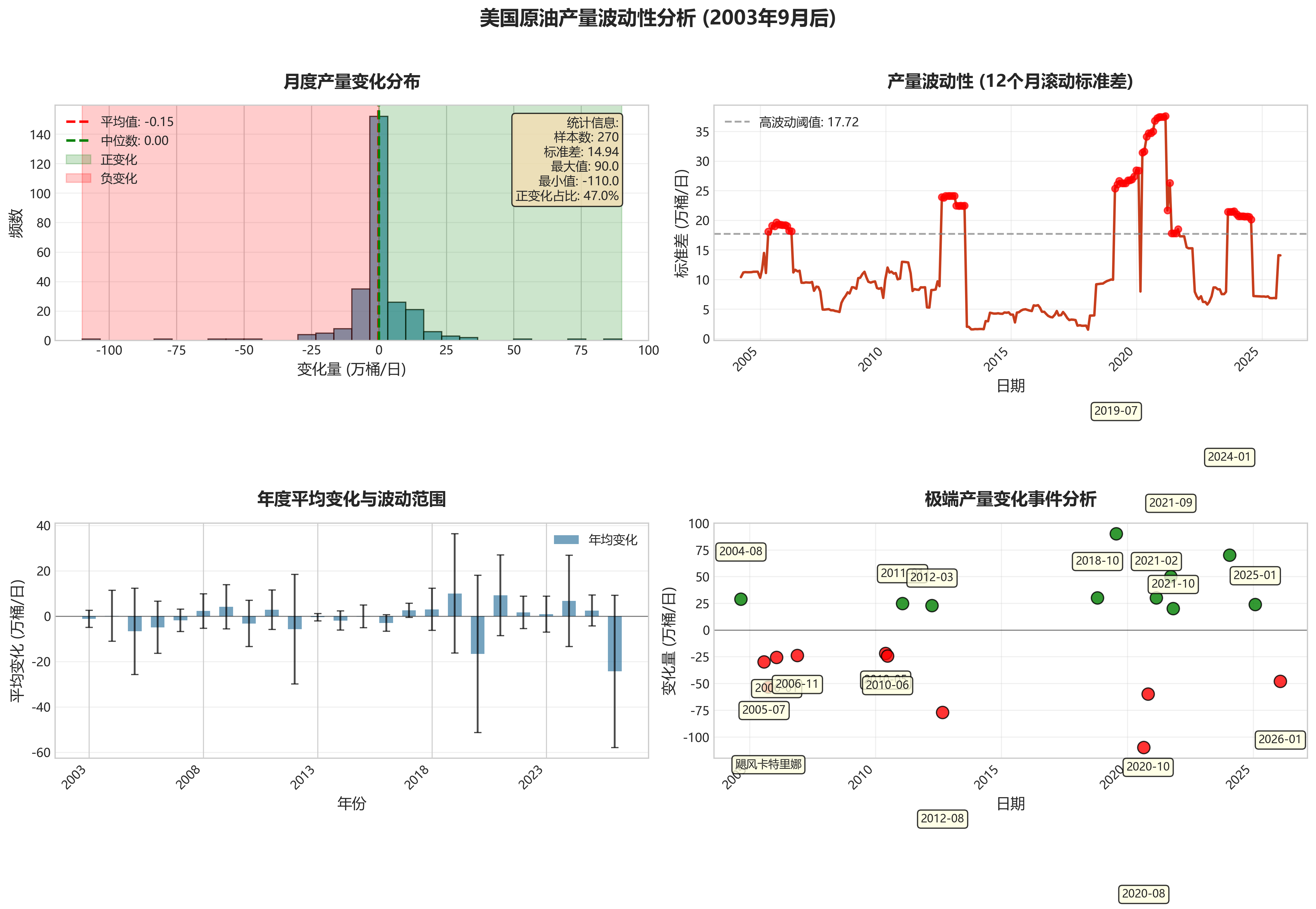 - 稳定/增长期:2011-2014年、2017-2019年,在相对高油价和页岩技术扩散的驱动下,产量变化以正向为主,波动率相对较低,呈现趋势性增长。